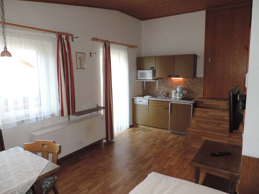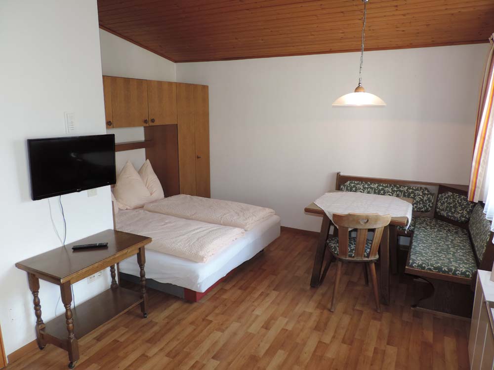 Unser Appartement Typ A ist für ein bis zwei Personen ideal. Es besteht aus einem Wohnschlafraum inklusive einer ausziehbaren Schlafcouch, einer voll ausgestatteten Küchenzeile sowie Dusche und WC.